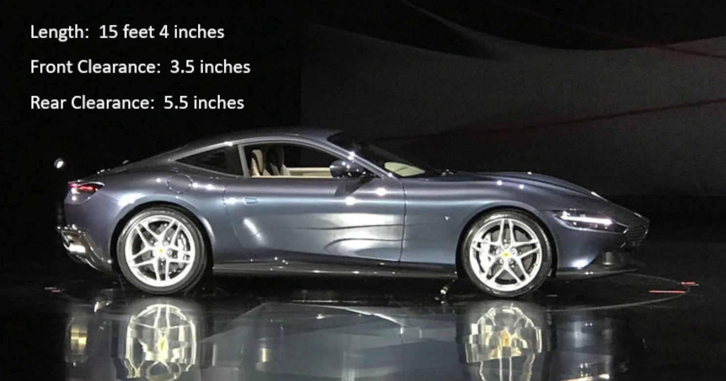 The 2020 Ferrari Roma is 15’4″ long with a front clearance of 3.4″ and a rear clearance of 5.5″.