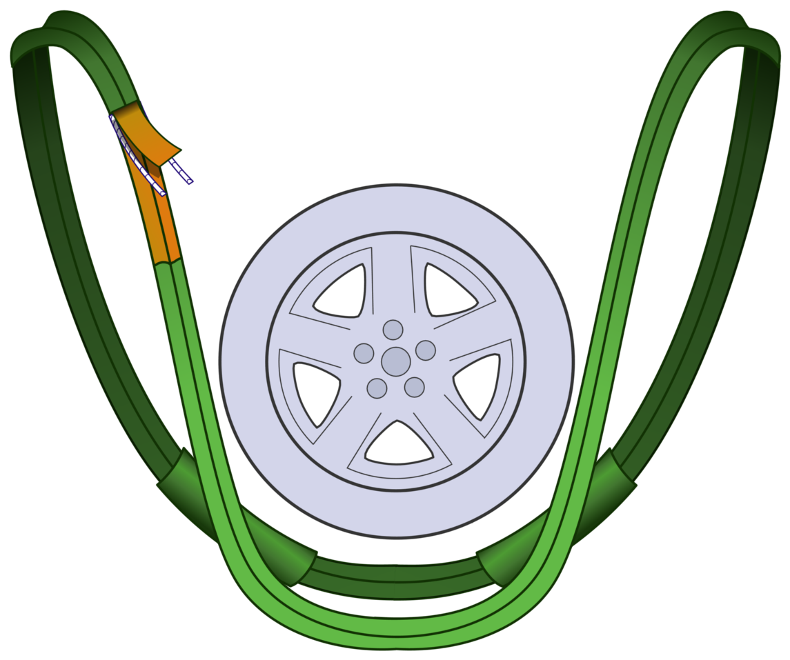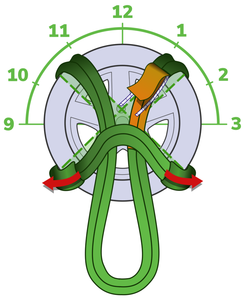 Making a smiley face (the longer end being in the front). Keeping each hand on each side of the strap, one side goes around the tire followed by the other side going past the 12 o’clock position.