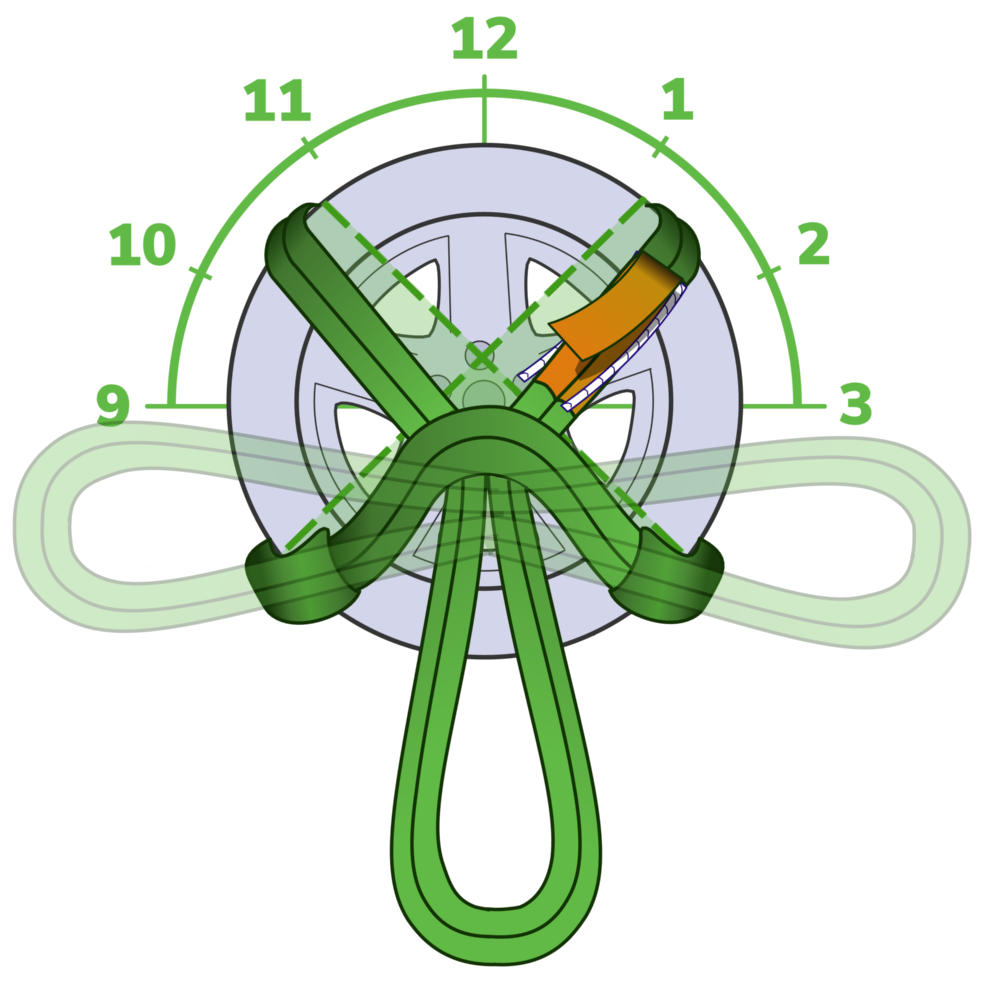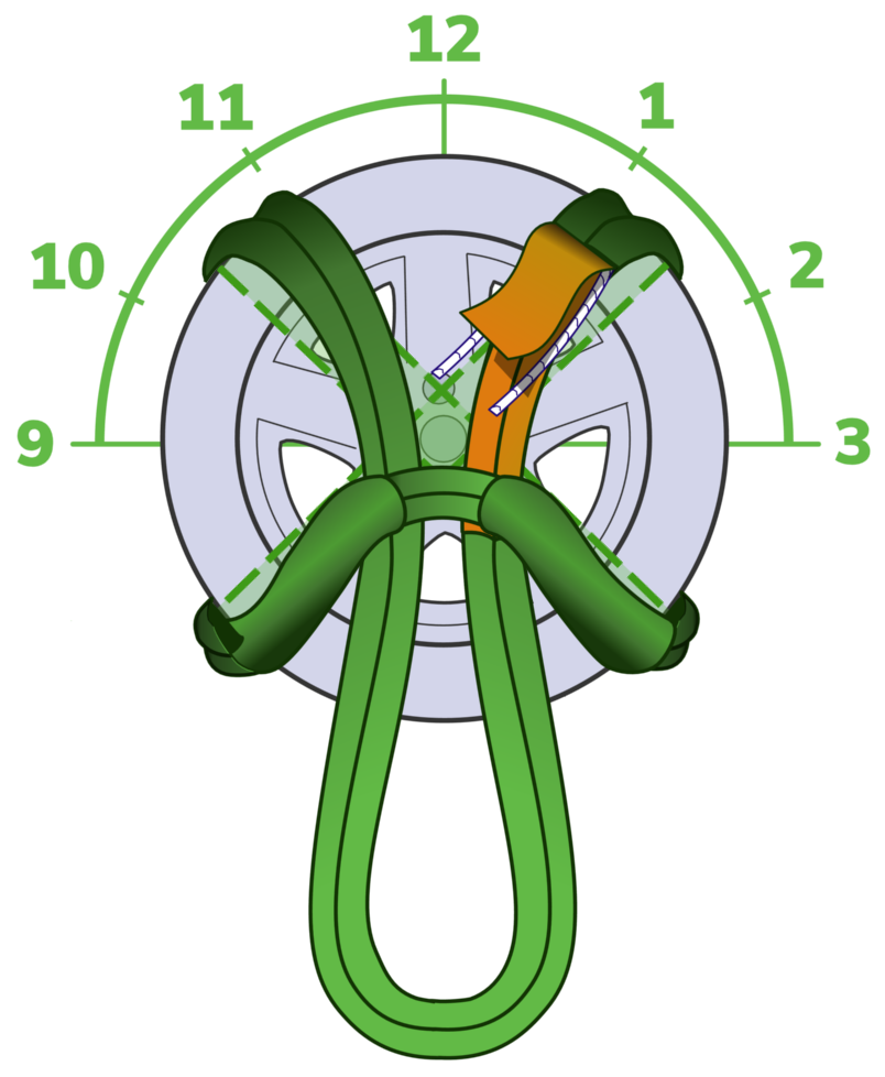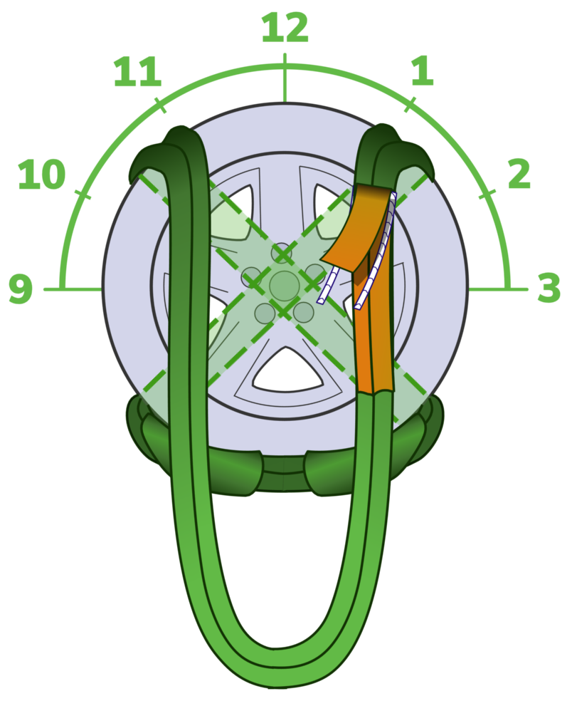 In result, one side of the strap will end up sitting at 10 to 11 o’clock, and the other side will sit around 1 to 2 o’clock. (This will ensure that the straps create an ‘X’ shape on the back-side of the tire.
