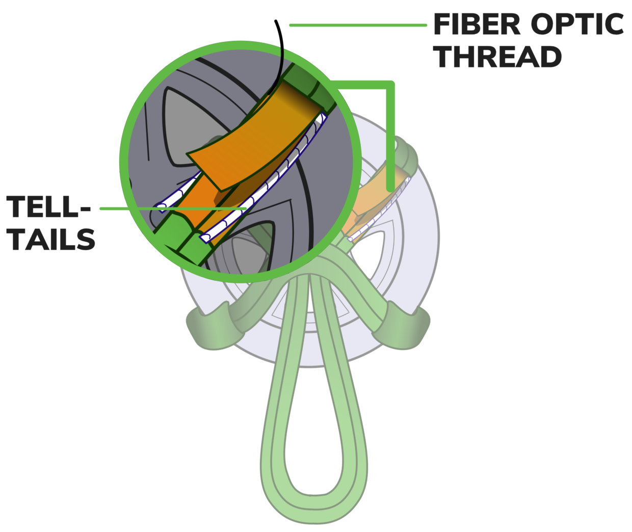 These are part of the internal structure of this strap. In the event that the strap has been overloaded, the tails will start to disappear inside the cover. If less than half inch is exposed, the sling should be removed from service.
