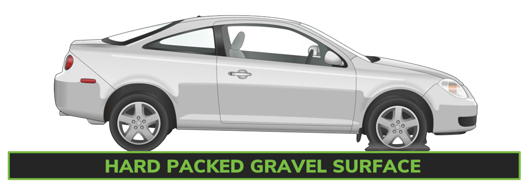 - The car is on a hard packed gravel surface.