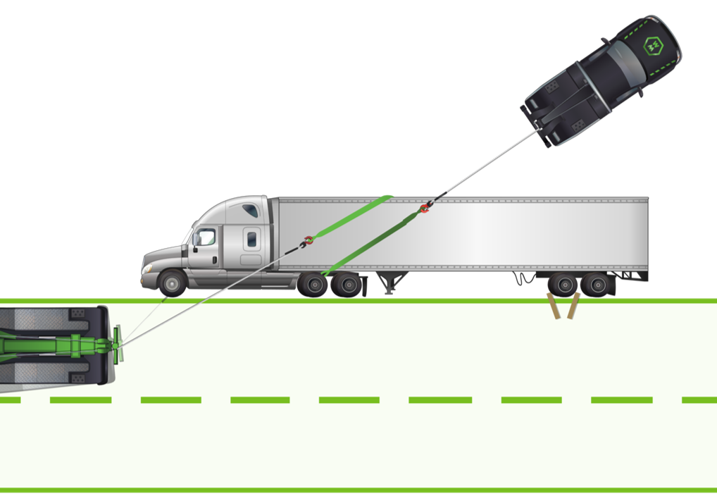 We’re going to establish that we can up-right this tractor and trailer using a single heavy-duty tow truck. This procedure is best done on a commercial vehicle with less than 10,000 pounds of cargo in the box.