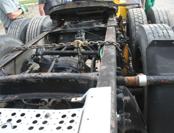 To run the chains properly: come up under the axles over top of the frame and hook them together. (Do not hook into the frame. Go chain to chain and from the 5th wheel plate.) From there go down, under the axles and back to the cross bar and receivers.