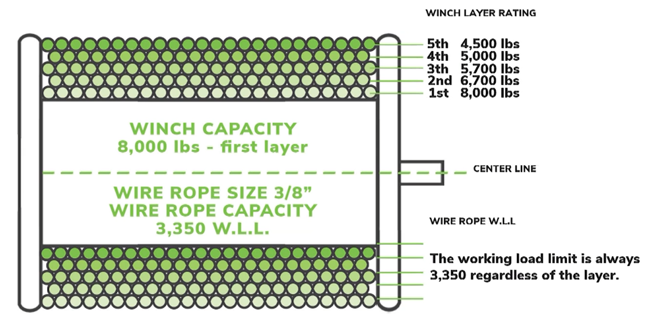 Even after the pulling capacity of the winch has been reduced to 4,500 lbs at five layers of wire rope gathered to the winch, you can see that the working load limit can still be exceeded of the wire rope. A wire rope having a working load limit of 3,350 lbs can be exceed, even at the fifth layer of wire gathered on to the winch. It’s important that every operator understands that the pulling power of the winch can exceed the working load limit of the wire rope. Therefore, when asked the question, “how much force should ever be placed on to my winch”, the answer is equal to the wire rope Working Load Limit.